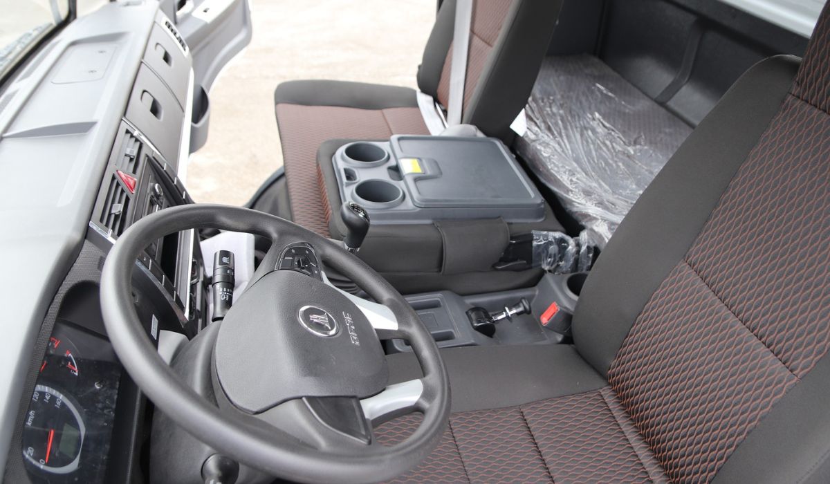 Điểm nổi bật đầu tiên trong nội thất xe tải Đồng Vàng 800 chính là khoang cabin rộng rãi, đủ chỗ cho 3 ghế ngồi được bọc nỉ cao cấp, tạo cảm giác êm ái, không bị nóng lưng khi lái xe thời gian dài. Ghế phụ giữa có thể gập xuống thành bàn tiện lợi, trang bị hộc để cốc và ngăn đựng đồ nhỏ.
